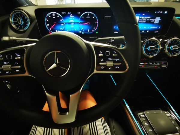 A kettős kijelzőjű műszerfal tűéles grafikát és megjelenítést takar, ám ami igazán meglepő volt, hogy a beépített és magyar nyelvű navigáció a valóságot a virtuális világgal ötvözi. Elsőre szokatlan, hogy a konzolon nem a megszokott térképnézetet látjuk, hanem pl.: kanyarodáskor vagy piros lámpánál a visszapillantó tükörbe beépített kamera működésbe lép és az előttünk lévő környezetet vetíti ki elénk. A tájékozódást segítő, valós konzolképhez könnyen hozzá lehet egyébként szokni, mint ahogy ahhoz is, hogy a legtöbb funkciót vagy a kormányon található gombokkal, vagy pedig a váltó helyén kialakított érintőpaddal tudjuk szabályozni. Bár az egy hetes teszt kevés volt ahhoz, hogy az autó minden funkcióját, így például a hangvezérlést is kipróbáljam, de az elvitathatatlan, hogy a személyre szabhatóság a Mercedes GLA egyik nagy újítása.