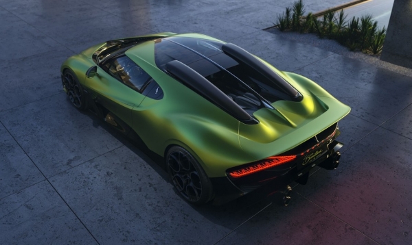 Szokatlan zöld színkombinációt kért a megrendelő, a szénszálas alsó karosszériaelemek színe a szaténfestéshez illeszkedik. A belső kárpitok színe is ehhez igazodik, beleértve a lovas ihletésű skót kockás mintát is az üléseken.