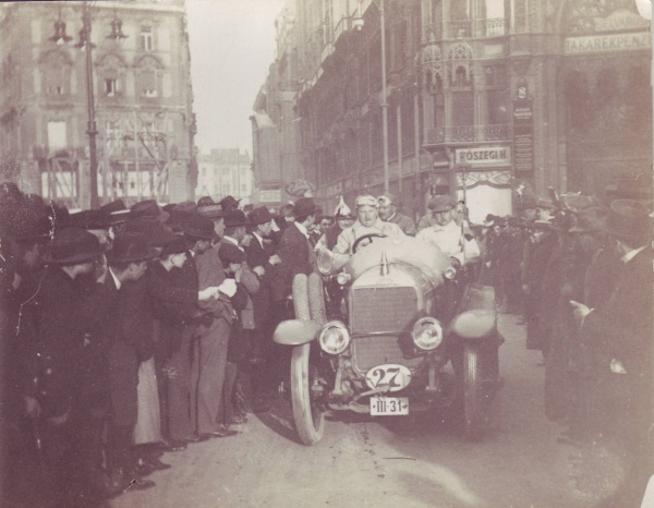 Jacques Werlin a Királyi Magyar Automobil Club „Túraút a Kárpátokba” versenyének startjánál a Kígyó (ma Ferenciek) terén 1914-ben.