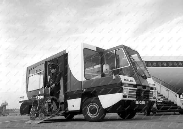Speciális, rámpával ellátott minibusz a Ferihegyi repülőtéren 1980-ban. A MALÉV mozgássérülteknek, rokkantkocsikkal közlekedőknek két Steyr-City autóbuszt vásárolt. Ezzel a különleges járművel viszik a Ferihegyi repülőtéren a tranzit váróteremből a repülőgéphez a rászoruló utasokat. (Forrás: MTVA Archívum)