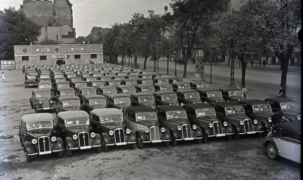 Egy reklámfotó 1939-ből. 102 darab, vizsgázásra váró DKW autó a Lehel téri Majláth központ előtt. Fotó: Seidner Zoltán. Forrás: Magyar Nemzeti Múzeum Történeti Fényképtára