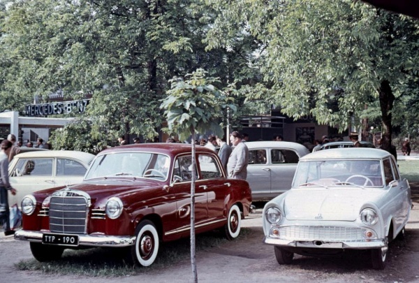 A négy karikás márka a Mercedes tagjaként jelent meg az 1959-es Budapesti Ipari Vásáron. Forrás: Fortepan/Móra András/114980