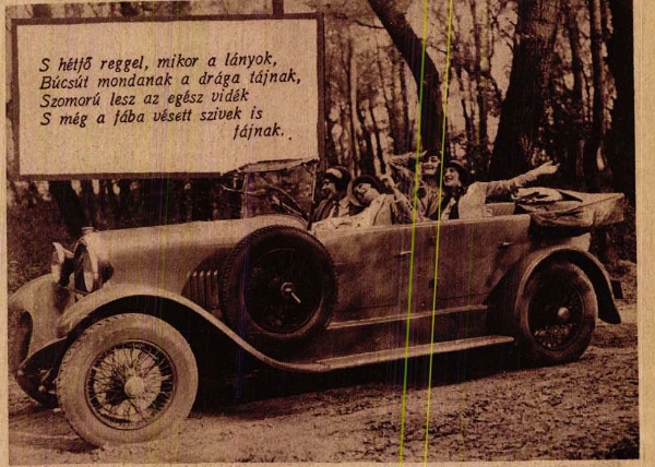 Színes riport a Színházi Élet 1928-as egyik számából, amikor színésznők kirándultak Delaunay Belleville autóval (Forrás: ADT)