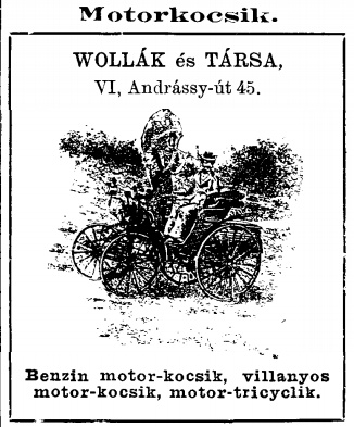Hatsek úttörő kísérletei után 1898-ben jött létre az első olyan vállalat, amelynek profiljába az autókereskedelem is tartozott. A Wollák és Társai az Andrássy út 45 alatt rendezkedett be kerékpárok és „Benzin motor-kocsik, villanyos motor-kocsik, motor-tricyclik” árusítására. Utóbbi közlekedési eszközökkel csupán egy évig foglalkoztak.
