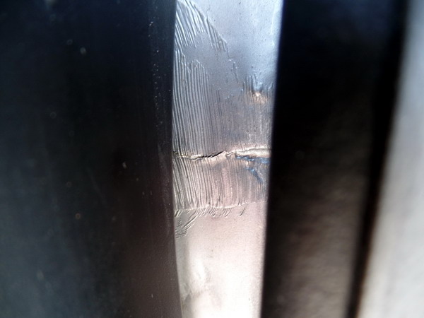 …és látható az is, hogy a fényezés máris meg van repedve. Ha nem zár megfelelően a fényezési réteg, akkor oda mi jut be? Na, mi? A nedvesség. És jaj annak az acélnak, amire víz jut. Míg egy gyári kivitelnek eszébe sem jut 15 évnél előbb rozsdásodni, egy így javított autónak – pláne ha nem garázsban áll – én legfeljebb 3-4 évet jósolok, mielőtt hallani kezdjük majd a rozsda csámcsogását. El ne felejtsem, naná, hogy mindkét oldalon ilyen volt.