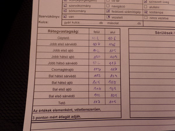 Azt írják, „Az értékek elemenként, véletlenszerűen, 3 ponton mért átlagát adják.” Bizony bajban lennék, ha nyelvtanilag kellene elemeznem a jegyzőkönyv mondatát, minden esetre úgy értelmeztem, hogy az értékek, amiket beírva látok, egyenként három érték számtani átlagaként adódtak. Tehát: minden érték kiszámolásához 3 ponton mérték meg a karosszéria elemeket. Minden elemen három mérés fent és lent is. (Ez már tényleg csak kukacoskodás, de a tetőlemezen most akkor felről le, vagy leről fe? – Besenyő Pista bácsi után szabadon.)