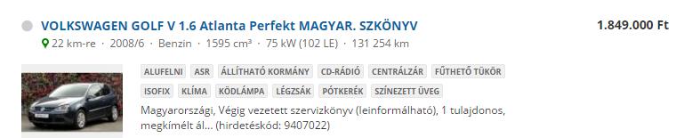 A legolcsóbban kínált 2008-as Golf 1.6 Atlanta (Forrás: hasznaltauto.hu)