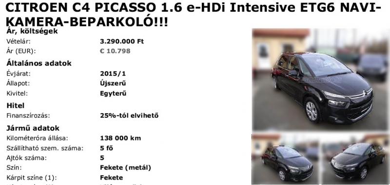 Decemberben Székesfehérváron vizsgáltunk egy Citroën C4 Picasso e-HDI-t mégpedig a legmagasabb, Intensive felszereltséggel. Minden megrendeléskor lementjük a jármű hirdetését, úgyhogy természetesen ez is megvan még.