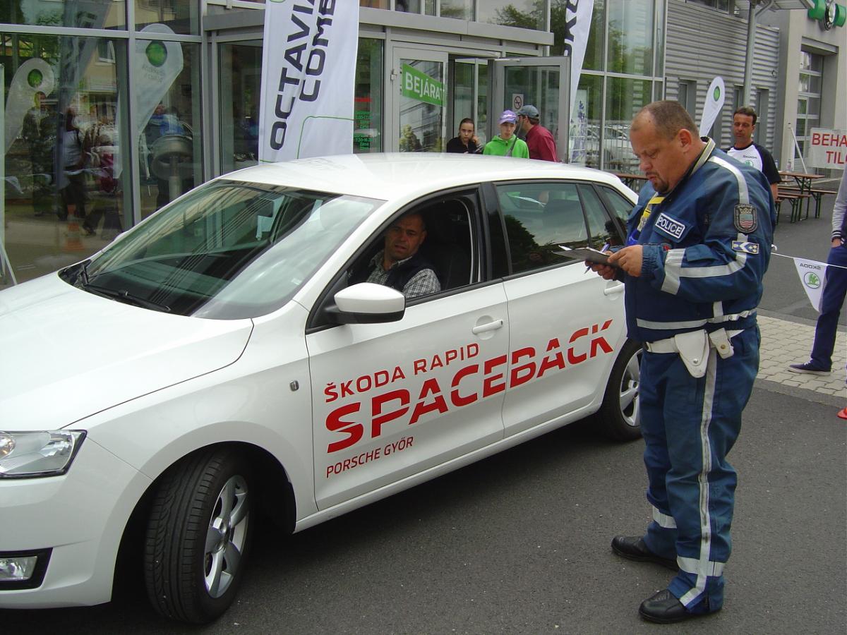 Rosta Roland, a Győr-Moson-Sopron Megyei Rendőr-főkapitányság századosa, a megyei baleset-megelőzési bizottság titkára és csapata szombat reggel kilenc órára gondosan előkészítette a Porsche Győr Skoda telephelyének udvarán a szlalom pályákat, ahol a szülők autóval ügyességi pályán, a gyerekek pedig kerékpárral ugyancsak egy szlalom pályán teljesítették a feladatokat.