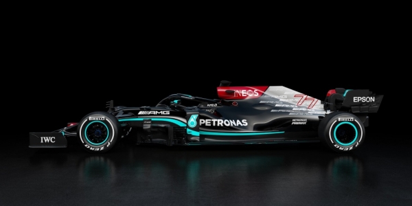 A szponzorok matricái miatt egyre kevesebb a nyers felület, a W12-es jelzésű 2021-es versenyautó karosszériáján már csak nyomokban található a klasszikus ezüst szín. Igaz, a karbonkompozit színe nagyon már, mint a fémé.