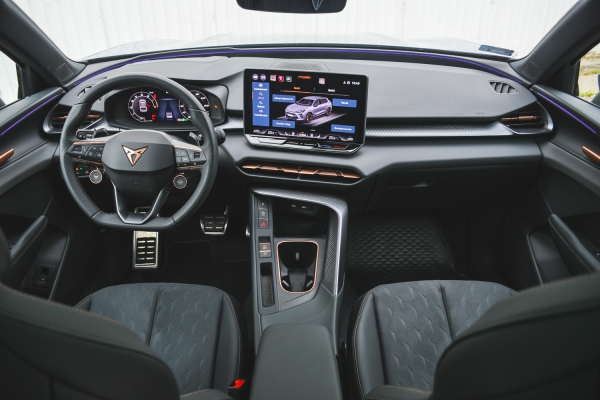 Szépen komponált, letisztult és rendkívül jól összeszerelt a kabin. Nem olyan elvetemült, mint a Tavascan, de a hegyes és éles, legtöbbször szintén félfényes rézzel tört elemek miatt sportos hangulatot áraszt, a látványos és kényelmes kagylóülésekről nem is beszélve. Talán a fekete kabin is rátesz, de nem érződött tágasnak a beltér. 540 literes csomagtartója a nagyobbak közé tartozik a szegmensben, mégsem fért el benne hosszában egy babakocsi, és hiába megfelelő méretű a hátsó lábtér, a középső ülésen már nem férne el egy harmadik személy szellősen. Igen, egy családi autónál ilyeneket is le kell írni, pedig a showt egyértelműen elviszi a GTI motor.