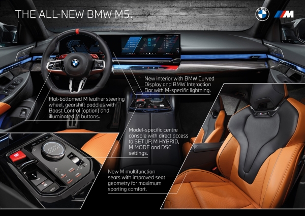 A középkonzolon elhelyezett M-specifikus vezérlőpanel mellett az új BMW M5 progresszív sportautó-utastere már alapfelszereltségként újratervezett, világító M gombokkal és laposabb alsó karimával ellátott BMW M bőrkormányt, elektromosan állítható BMW M multifunkciós üléseket, M-specifikus tartalmakkal dolgozó BMW Ívelt Kijelzőt és BMW Head-Up kijelzőt kínál. A BMW Maps felhőalapú navigációs rendszerrel és kiterjesztett nézettel (Augmented View) dolgozó BMW Live Cockpit Professional műszerfal-elrendezés ugyancsak az újdonság alapfelszereltségének része.