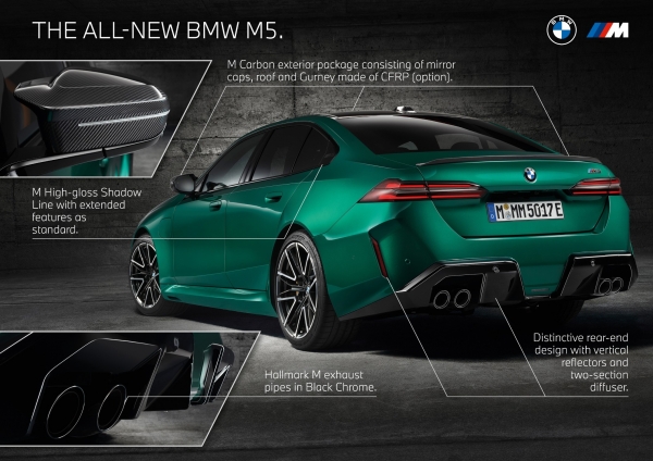 Az új BMW M5 (átlagos üzemanyag- és kombinált energiafogyasztás, illetve károsanyag-kibocsátás a nagyfeszültségű akkumulátor optimális töltöttsége esetén (WLTP): 1,6 – 1,7 liter / 100 km és 25,0 – 25,5 kWh / 100 km, illetve 37 – 39 gramm / km; átlagos üzemanyag- fogyasztás lemerült akkumulátorral (WLTP): 10,2 – 10,3 liter / 100 km; CO2-osztályok: a nagyfeszültségű akkumulátor optimális töltöttsége esetén B, lemerült akkumulátorral G) letaglózó erőtöbblete és vérpezsdítő menettulajdonságai a BMW M modellek nagyteljesítményű karakterének újraértelmezése mentén érkeznek meg az utakra.