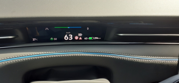 Kezdem az utolsó két órával, amikor a javasolt 80 százalékos akkumulátor töltöttséggel indultam vissza Szegedről Budapestre, a Frangepán utcába. Jó korán, így a még traffipax barát tempóra, azaz 140-re húzva a több fokozatban állítható távolságkövető tempomatot nagyon sima volt az út. Ráadásul kevés korábbi tesztautón találtam meg ilyen gyorsan azt, hogyan kell aktiválni a sebességtartó automatikát.