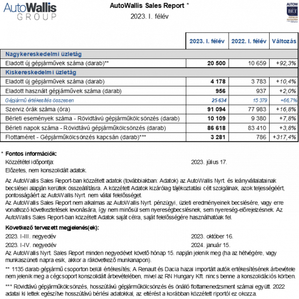 Az idei első félévben a Nagykereskedelmi Üzletágban közel duplázódott (+92,3%), 20.500 darabra ugrott az értékesítés 2022 első félévéhez képest, mely részben a tavaly végrehajtott Renault Hungária felvásárlásnak köszönhető (+5.998 db). Fontos ugyanakkor, hogy az akvizíció nélkül is 36,1 százalékkal (+3.843 db) bővült a szegmens, melyből a legerősebb növekedést ezúttal is a SsangYong mutatta fel (+2.295 db, +64,3%), amit az Opel bővülése követett (+1.439 db, +22,6%). A Kiskereskedelmi üzletág az első félévben 4.178 darab új (+10,4%) és 956 darab használt (+2%) gépjárművet értékesített, így teljesítménye jelentősen meghaladta a magyar személyautó-piac csökkenését. A Kiskereskedelmi üzletág szolgáltatási területén a szervizórák száma 16,8 százalékkal 91.094-re emelkedett, és az AutoWallis a rövidtávú gépjárműkölcsönzés területén is folytatni tudta a növekedést. A Csoport által Magyarországon képviselt Sixt 7,8 százalékkal 10.109-re növelte a bérleti események számát az első félévben, miközben a bérleti napok száma 3,8 százalékkal 86.618-ra emelkedett. A Nelson Flottalízing Kft. februári akvizíciójának köszönhetően a hosszútávú gépjárműkölcsönzés és flottamenedzsment szolgáltatások jelentősen emelkedtek, így az első félévben a Csoport 3.281 gépjárművel szolgálta ki ügyfelei igényeit.