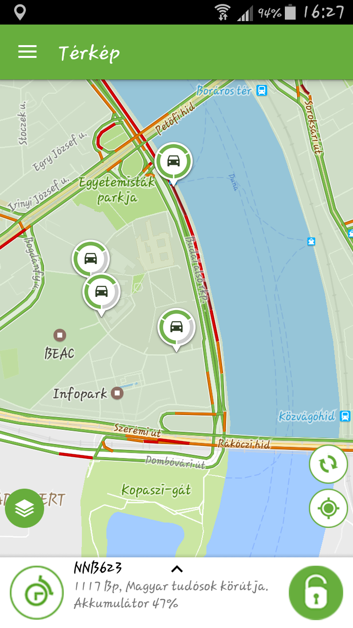 Az applikáción lehet kiválasztani, lefoglalni, aztán kinyitni az autót. A töltöttséget mutató adat csak tájékoztató jellegű