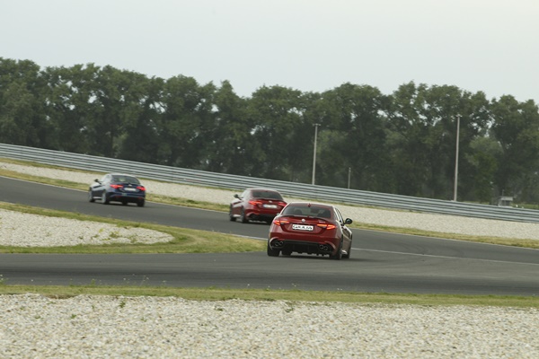 Ha már a dízelek ilyen jó formában vannak, túlzás nélkül kijelenthetjük, hogy a Quadrifoglioban olyan versenyfaktor van, amihez elkél egy extra adag józanság a sofőrök részéről utcai használat során. Összegezve a ringen tapasztaltakat elmondható, hogy nemcsak a menni tudás, a megállási képesség is kellőképp megszorongathatja a vetélytársakat, lehet szó Audi RS4-ről, BMW M4-ről, vagy a csillagos márka C63 AMG-jéről. A pályateszt során tökéletes kontrasztot adott a Giulia-flotta mellé beállított 4C és 4C Spider, ahol a kupé és roadsteres kasztni kuriózumát az 1750 köbcentis, 240 lóerős motorok és a kilencszáz kilogramm körüli önsúly teszi feledhetetlenné. A kistömegű sportautók esetében – ugyanazon pályacsíkon – azt tapasztaltuk, hogy az egyenes szakaszokban kicsit nagyobb végsebesség elérésére képesek a Giuliához viszonyítva, azonban a kanyarokban a nagyobb szedán stabilitása volt a meggyőzőbb.