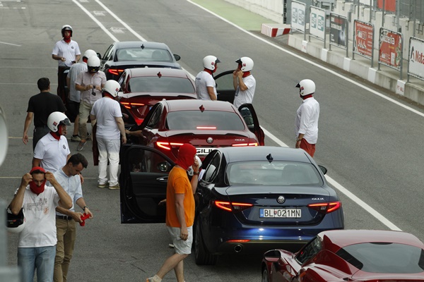 A tesztnapon a 2,2 JTD motorral és hatfokozatú manuális váltóval szerelt 180 lóerős verziókat a Slovakiaring környéki utakon vallattuk, és örömmel konstatáltuk, hogy a kulturált járású öngyulladós erőforrás mellé egy nagyon jól hangolt váltót kapott a Giulia. Rövid úton, jó ellenállással kapcsolhatók a fokozatok és, habár ezzel az autóval nem a legjobb köridő volt a gyáriak célja, a pályán tapasztaltak rácáfolnak erre. Az újságírók az erősebb, 2,9T jelzésű modelleket kapták, míg a dízelek feladata az instruktori felvezetés volt. A tempó, amit a csúcsdízelekkel diktáltak nekünk, komoly erőfeszítést igényelt a QV sofőrök legtöbbjétől, hogy tartható legyen, pedig 2,5-szeres erőtöbblet volt a talpunk alatt. A kanyartempónak csak a vezetni tudásunk szabott határt, de így is nagy élmény volt a 130-140 km/h-val sodródás, miközben teljesen stabilan az úton maradt a járgány. A fékek pedig a nagy terhelés ellenére sem fáradtak el, sőt! Pedig csak a sofőrcsere idejére álltak ki az autók a két nagysebességű kör után, aztán ment tovább az élményautózás több mint két órán keresztül.