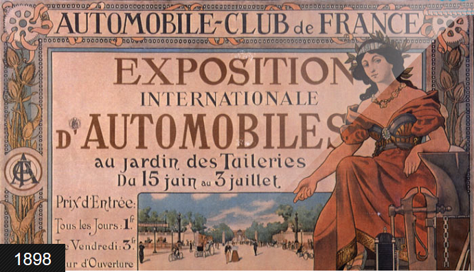 Az első párizsi autókiállítás helyszíne a Tülériák Kertje (Jardin des Tuileries) volt 1898-ban, ahol csupán egy maréknyi újkeletű masinát vonultattak fel a kiállítók, bizonyítva, hogy új szelek fújnak az egyéni és tömegközlekedés, valamint az áruszállítás terén. Természetesen az akkori miniszterelnök tartott ünnepi beszédet az esemény megnyitóján, de szkepticizmusát nem rejtette véka alá és stílusosan egy hintóval távozott.