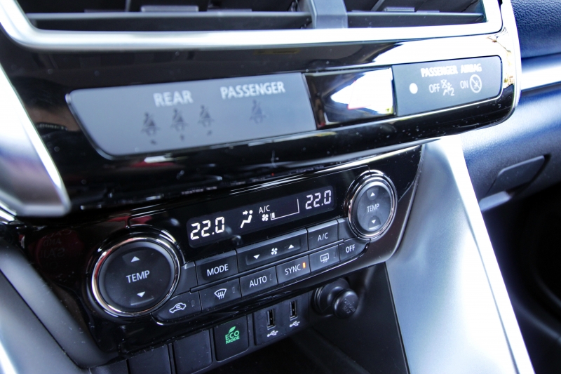 Szuper klíma van az Eclipse Cross-ban. Azonnal feltűnt, amikor a tesztút elején az átmelegedett utasteret kemény befúvással próbálta hűteni. Hamar zavaró lett a huzat, úgyhogy próbáltam valamit nyomkodni. A befúvás irányváltást a „MODE” gombbal tehetjük meg, de nem variálhatjuk úgy, ahogyan szeretnénk, hanem csak sorban fej-tor-potroh irányban.