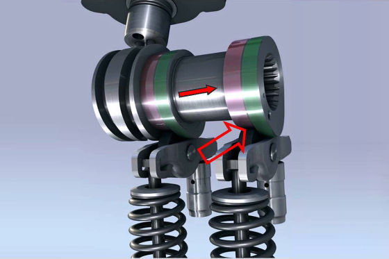 A bütyköt és a körgyűrűt egymás mellett, a vezértengelyre húzott, hosszbordás hüvelyen találjuk. A hüvelyt akkor tolják át, amikor a szelepemelő-görgő a bütyök alapkörén jár. A 2. és a 3. ábrák világítanak rá a működés mechanizmusára. A váltás, fordulatszámtól függően, 13 – 36 ms-t vesz igénybe, egy bütyköstengely körülfordulás alatt megy végbe. A hüvelyt golyós biztosítás tartja a kívánt pozícióban.