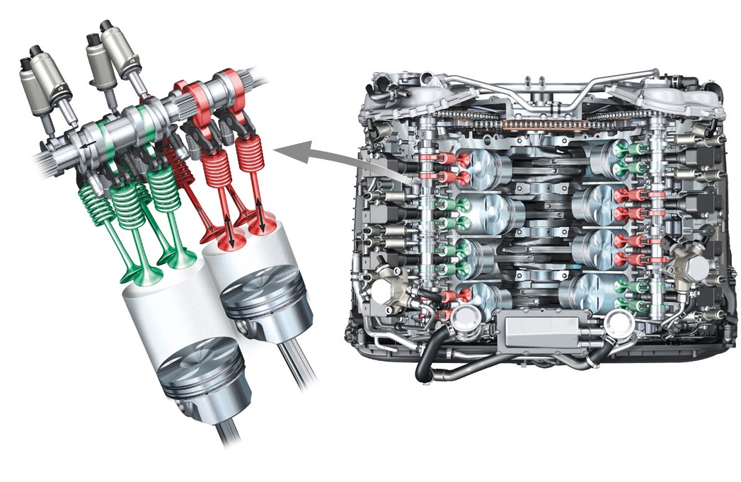 Az 1.4 TFSI COD motor esetében a rendszer – mint láttuk előbb – a kettes és a hármas, míg a 4.0 TFSI erőforrásban a kettes, hármas, ötös és nyolcas hengerre hat (5. ábra). A lekapcsolt hengerekben a gyújtás és a befecskendezés egyaránt szünetel.