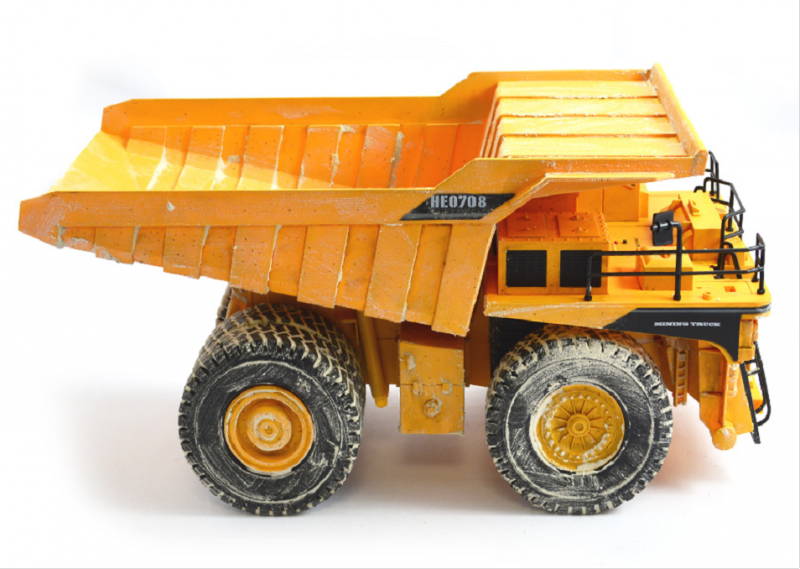 A jármű külső része itt is gyárilag koszolt. Stílszerűen homokkal van bekenve és ettől még látványosabb a dömper. A gyártó a gép apró részleteire is figyelt, illetve az egész gép összhatása meglepően szép, méretarányos. Bár a kerekek nem igazi gumik, itt ez nem igazán fontos mivel a valódi óriásoknál se igen tudnánk benyomni a gumi falát. A markolónkkal nyugodtan belepakolhatunk és vihetjük vele a szállítmányt.