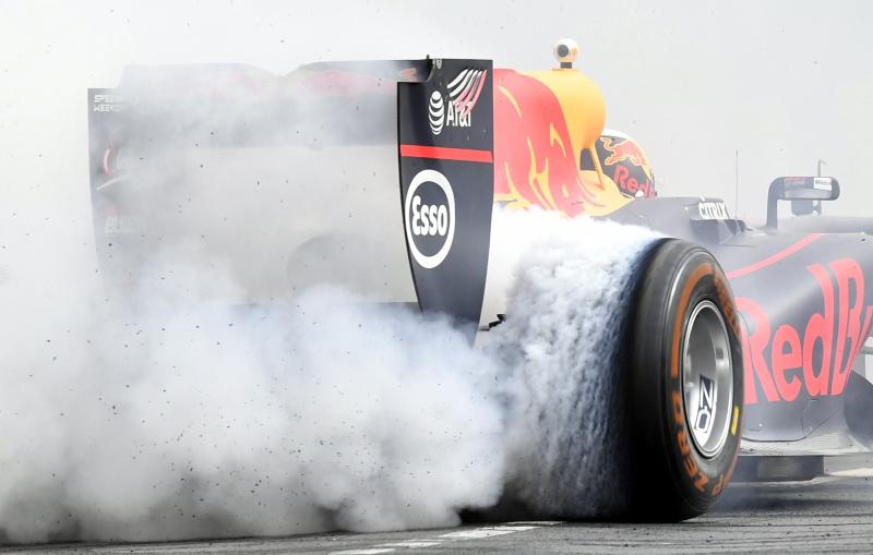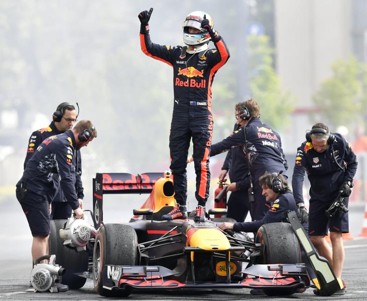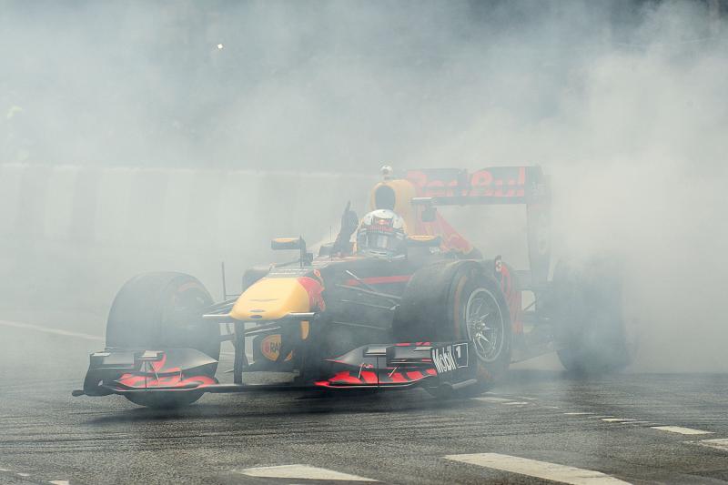 Daniel Ricciardo, a Red Bull Forma-1-es ausztrál pilótája egy 2011-es vb-győztes autóval az V. Nagy Futam elnevezésű autó- és motorsport-bemutatón Budapest belvárosában, a Deák Ferenc téren 2017. május 1-jén. MTI Fotó: Illyés Tibor
