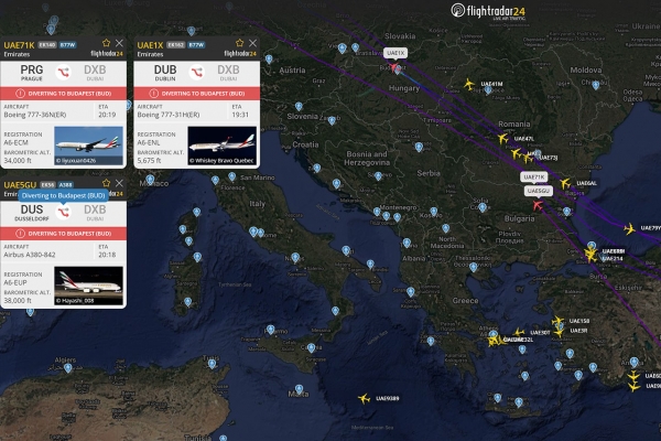 A Budapest Airport tájékoztatása szerint a közel-keleti konfliktus miatt három Emirates-járat Törökország felett visszafordult és Budapesten száll le. A gépek Dublinból, Düsseldorfból és Prágából indultak Dubajba, a három gép fedélzetén összesen 1215 utas tartózkodott.
