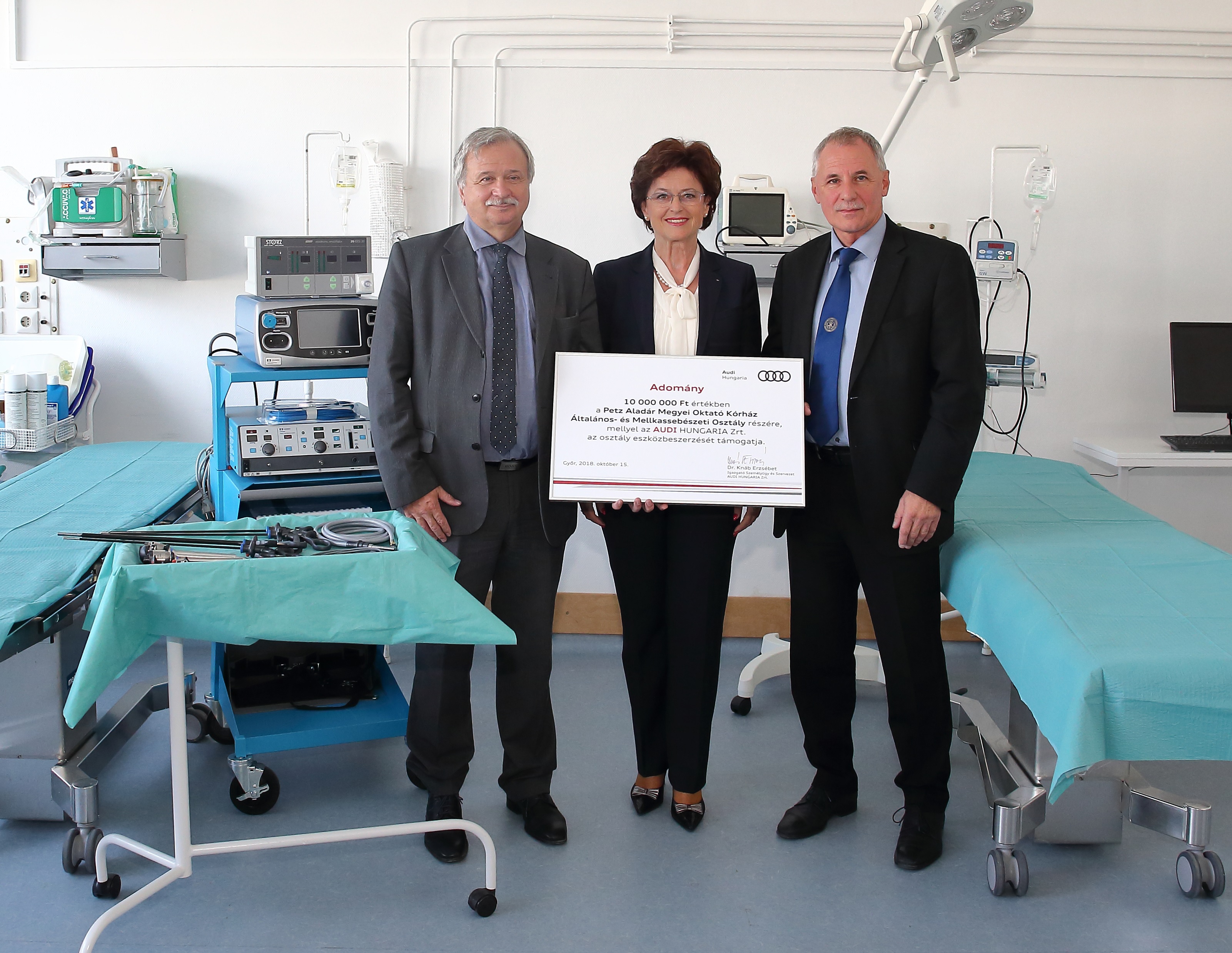 Az Audi 10 millió forint összegű támogatásával a kórház többek között laparoszkópos műtétekhez szükséges műszereket és speciális lézerkészüléket szerzett be, melyek a modern sebészeti eljárásoknál korszerű és nélkülözhetetlen eszközök. A speciálisan laparoszkópos beavatkozásokhoz kifejlesztett berendezésekkel az Általános- és Mellkassebészeti Osztály hatékonyabb működéséhez járult hozzá az Audi.