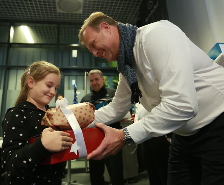 Christian Wolff, a Mercedes-Benz Manufacturing Hungary Kft. ügyvezető igazgatója ajándékot ad át.