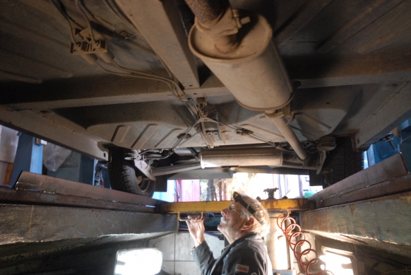 Alaposabb mustrához emelő vagy akna kell, a műhelyben alulnézetből is kedvező a látvány, bár van ami cserére szorul: normál műszakin még megfelelt, de ajánlatos beszerezni egy új kipufogódobot és kijavítani néhány apróbb sérülést.