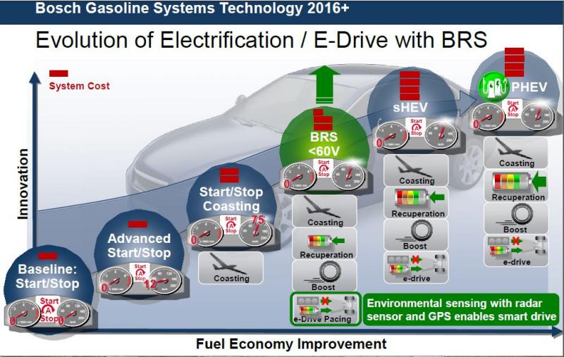 A Bosch áttekintése rendkívül informatív, és cikkünk témájaként megjelölt 48 V-os (az ábrán <60 V) mild hibrid megoldást emeli ki.