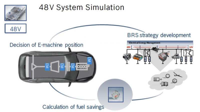 A 48 V-os rendszer kialakításában sokféle lehetőség van, ma még többesélyes a kialakítás. A Bosch egy, a lehetőségeket taglaló vázlatát mutatjuk az ábrán. A villanymotor/generátor elhelyezésre van több alternatíva.