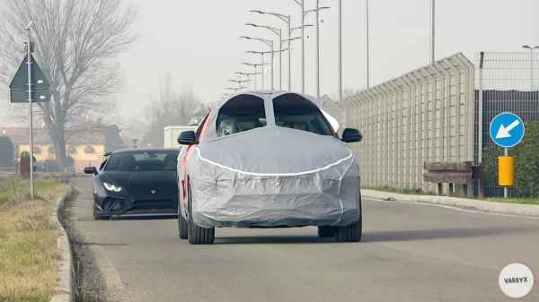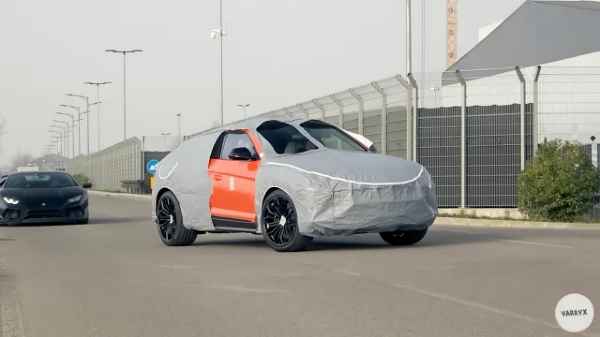 A szürke ponyva alatt egy narancssárga Urus látható. Valamennyire. Hiszen ez az álcázás lényege. Hogy ne sokat fedjen fel az egyelőre inkognitóban jelen lévő autó külleméről.