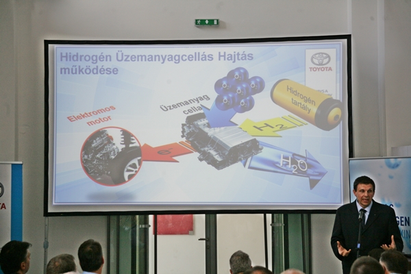 A hidrogén jelenét és jövőjét, valamint általános tudnivalóit Krajcsovits Sándor, a Toyota Central Europe termékmarketingért felelős menedzsere ismertette annak okán, hogy a japán márka úttörő szerepet játszik a hidrogén üzemanyagcellás autók fejlesztésében, mivel az EU-ban 300 darab, globálisan pedig csaknem 6 ezer darab járművük fut az utakon. A hidrogén a legkülönfélébb forrásokból, bioenergiából, fosszilis anyagokból, elektrolízissel vagy az energiaipar melléktermékeként is előállítható. A 19. század elején már a közvilágításhoz is használtak hidrogént, az azóta eltelt időszak kutatásai és fejlesztései nyomán mára kijelenthető, hogy a hidrogén bolygónk legzöldebb energiahordozója, szénmentes előállításának köszönhetően teljesen átrajzolhatja a világ energetikai térképét. Az elektromos árammal szemben sokkal inkább alkalmas a rövid és hosszú távú tárolásra, természeténél fogva a felhasználás helyén zaj- és emissziómentes hasznosítást biztosít.