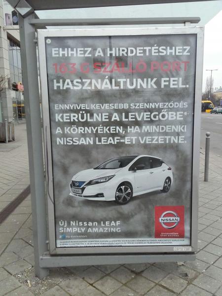 A JCDecaux a Nissan megbízásából 26 egyedi reklámtáblát helyezett ki Budapesten. Az alapvetően fehér plakátokat annyi szálló porral permetezték be, amely – az átlagos évi forgalom alapján – egy nap alatt a személygépkocsikból a levegőbe jut az adott csomópontok körüli 100 m sugarú körben. Az 51 g, amely a Kassai téri 32-es busz megállójában álló plakátra került, talán nem tűnik olyan ijesztőnek, a Boráros téri 4-6-os villamosmegállóba kihelyezett reklámtáblára azonban 263 g, míg a Corvin-negyednél, ugyanezen villamosok megállójában álló plakátra 190 g szálló por került. A plakátok a felhasznált por mennyiségétől függően a világosszürkétől kezdve a majdnem feketéig a szürke szinte minden árnyalatában pompáznak, a feliratokon pedig azt láthatjuk, mennyivel kevesebb szálló por kerülne a levegőbe naponta, ha mindannyian elektromos autóra váltanánk.