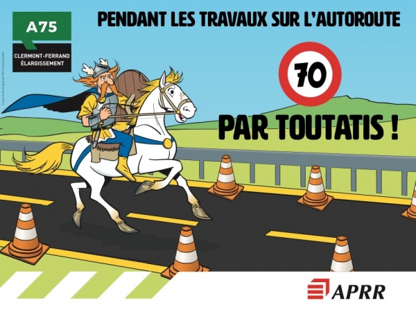 Ahhoz, hogy a francia Auvergne-i régió autósait a sebesség csökkentésre ösztönözzék az A75-ös autópályán, az APRR francia autópálya üzemeltető vállalat öt humoros üzenetű táblát telepített. Clermont agglomerációjában, Brézet, Pardieu és Aubière bejáratainál az autósok egy lóháton közlekedő gallot láthatnak, aki a híres Asterix, a gall felkiáltást teszi: 70-nel Toutatis szerint!