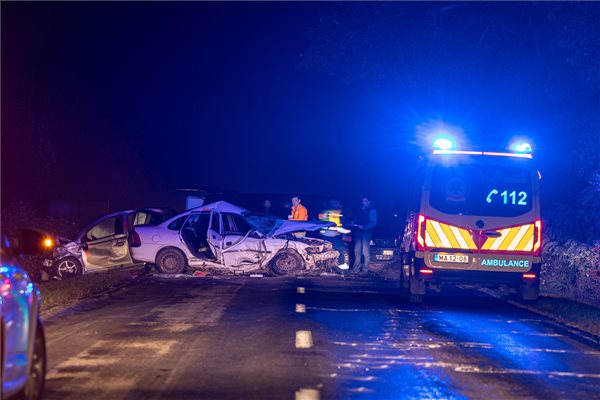 Egy a hétvégi tragédiák közül. Ütközésben összetört személygépkocsik az 54-es főút 22-es kilométerénél, Jakabszállás közelében 2020. október 25-én. A balesetben többen megsérültek, egyikük a helyszínen életét vesztette. MTI/Donka Ferenc
