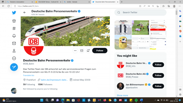 A Deutsche Bahn Twitter oldalán folyamatosan tájékoztatják az utasokat. Képernyőfotó.