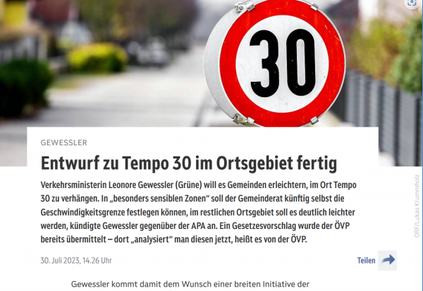 Arra a kérdésre, hogy az önkormányzatok könnyebben, önállóan – azaz jóváhagyási eljárás nélkül – 30 km/órás sebességkorlátozást vezethetnek be a helyi területeken, 57 százalék válaszolt a felmérésben „Igen, határozottan” (26 százalék) vagy „inkább igen”-vel. (31 százalék). A szavazói magatartást is vizsgálták. Egyedül az FPÖ szavazói voltak többségben a tervek ellen, a zöldek szavaztak a legvilágosabban mellette.