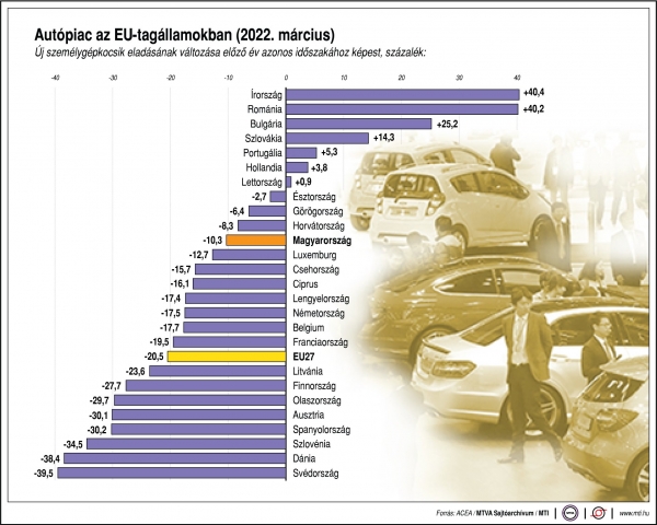 Magyarországon márciusban 11,1 ezer új személygépkocsit helyeztek forgalomba az ACEA adatai szerint, ami 10,3 százalékkal kevesebbet az egy évvel korábbi 12,4 ezernél, az első negyedévben pedig 28,7 ezret, ez 10,9 százalékkal kevesebbet a 2021 első negyedévi 32,2 ezernél.