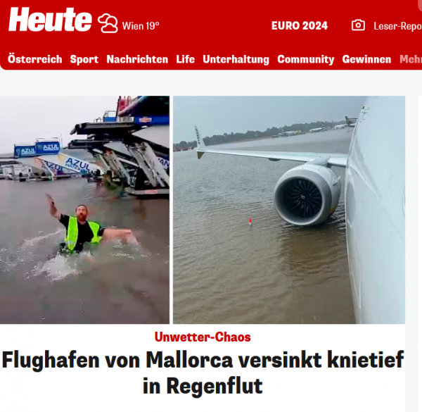 Heves viharok több ezer vendég utazási örömét akadályozzák Palma de Mallorca repülőtéren. Mivel a repülés jelenleg szóba sem jöhet, további értesítésig minden fel- és leszállást felfüggesztenek. A heves esőzések gyorsan elöntötték az egész kifutópályát.