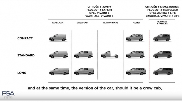 A PSA cégcsoport mind a négy márkája (Peugeot, Citroëen, Opel, Vauxhall) az év második felében megkezdi a teljesen elektromos kisteherautók forgalmazását, jövőre pedig azok kisbusz-változatait is piacra vezetik – jelentette be Xavier Peugeot, a francia autómulti haszonjármű-gyártó ágazatáért felelős alelnöke június végi online sajtótájékoztatóján. Az új e-teherautók Peugeot e-Expert, Citroëen ë-Jumpy, Opel és Vauxhall Vivaro-e, illetve a 6-9 személyes kisbuszok esetében Peugeot e-Traveller, Citroëen ë-Spacetourer, valamint Opel és Vauxhall Zafira e-Life néven kerülnek majd forgalomba.