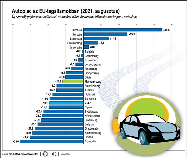 Az öt nagy piacból a legrövidebbet a spanyol húzta, augusztusban 29 százalékot zuhant az értékesítés. Az olaszoknál sem jobb sokkal a helyzet, 27 százalékos az esés. A magyar piac is érzi az európai trendet, augusztusban az Európai Autógyártók Szövetségének (ACEA) adatai alapján 11,7 százalékos volt az elmaradás 2020 augusztusához képest, júliusban 12,3 százalékot estünk. Az országok között pluszos Horvátország (8,3 százalék), Észtország (3 százalék), Írország (24,9 százalék), Lettország (14,3 százalék), Románia (44,6 százalék).