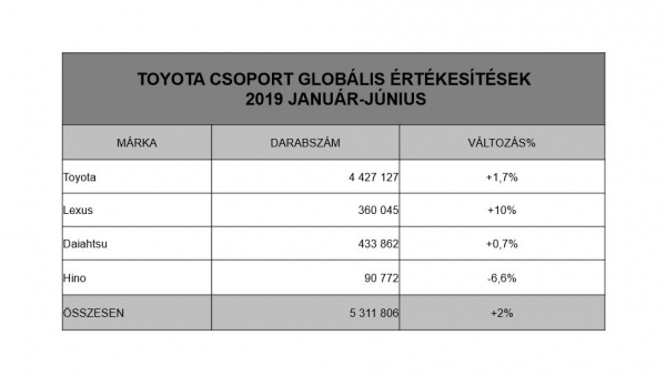 Márkánként vizsgálva a világ vezető autógyártójának és mobilitási szolgáltatójának teljesítményét, 2019 első félévében a Toyota 4.427.127 új autó értékesítésével 1,7%-os növekedést, a Lexus 360.045 új autó értékesítésével 10%-os növekedést, a Daihatsu 433.862 új autó eladásával 0,7%-os bővülést, míg a Hino 90.772 új autó értékesítésével 6,6%-os csökkenést könyvelhetett el.