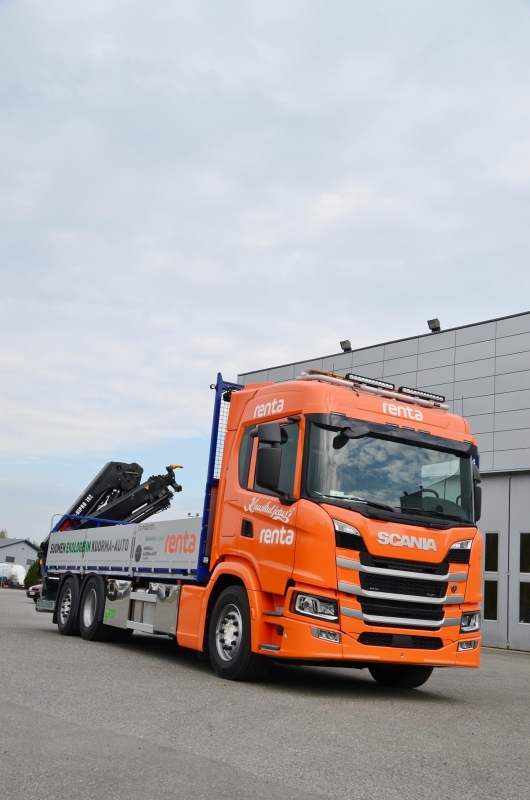 Ez Finnország első LNG-üzemű tehergépkocsija hálózatról tölthető, akkumulátorról működő, elektrohidraulikus daruval felszerelve. Erre a szokatlan párosításra a Kuuskuljetus által a Renta Group cégcsoportnak végzett fuvarfeladatok kapcsán esett a választás. A Renta állványzatokat szállít ki a fővárosban, Helsinkiben, méghozzá a hajnali órákban is, amikor a lakosok alszanak. Mivel a gázüzemű teherautó sokkal csendesebb, zavartalanul pihenhetnek a lakók.