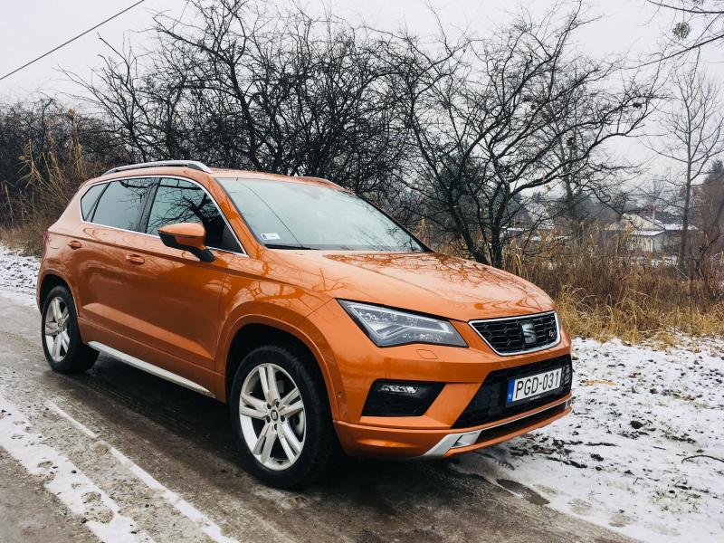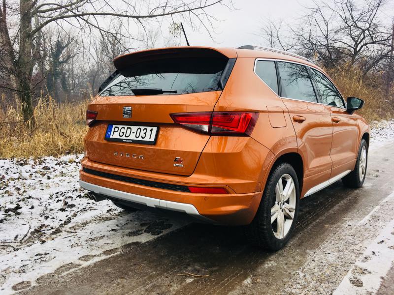 Hogy valamelyest kitűnjék a többi Ateca közül, FR-feliratú, jó fogású kormánykerék, alumínium pedálok, vörös varrások és kényelmes sportülések gazdagítják. Látványos show elem a visszapillantó aljába épített kis LED, amely az Ateca sziluettjét és nevét rajzolja sötétben az aszfaltra. Ennél sokkal hasznosabb a 360 fokos nézetet adó kamera, az éjszakát nappallá változtató teljesen LED fényszórók, valamint vezetősegédek garmadája: van keresztirányú-forgalom asszisztens, holttérfigyelő, kormányzásra is képes sávtartó, városi koccanásgátló - hogy csak a legfontosabbakat említsem. A kényelmi berendezések sorát nyolc hüvelykes érintőképernyő, teljes mobiltelefonos kapcsolódás, vezeték nélküli mobiltöltő, ülésfűtés, motoros csomagtérajtó gyarapítja. A csomagtartó a 4x4-es hajtás miatt kisebb, 510 helyett csak 485 liter, a csomagok elrendezését nem segítik rögzítési pontok, hálók és egyéb hasznosságok sem. Az ülések ledöntésével 1,5 köbméteres teret kapunk.
