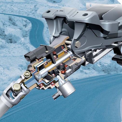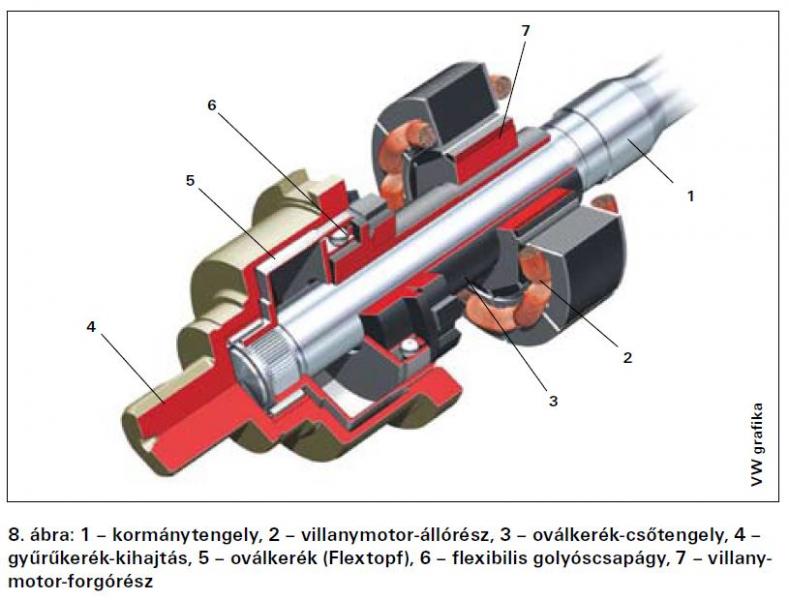A változó áttételt adó, villanymotorral hajtott hullámhajtómű (ZF gyártmány) a kormányoszlop integrált eleme.