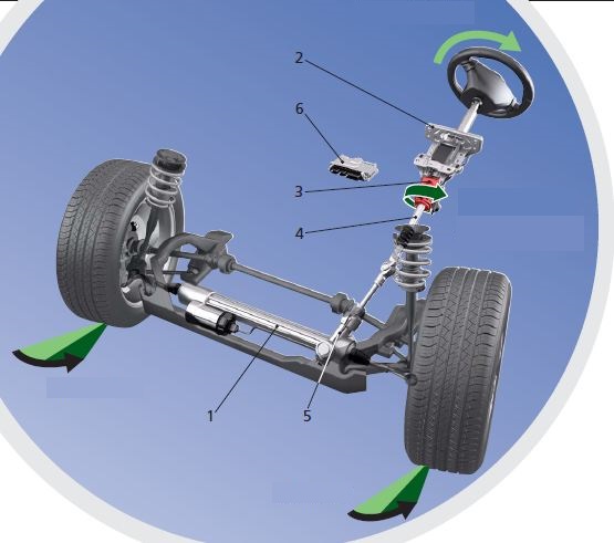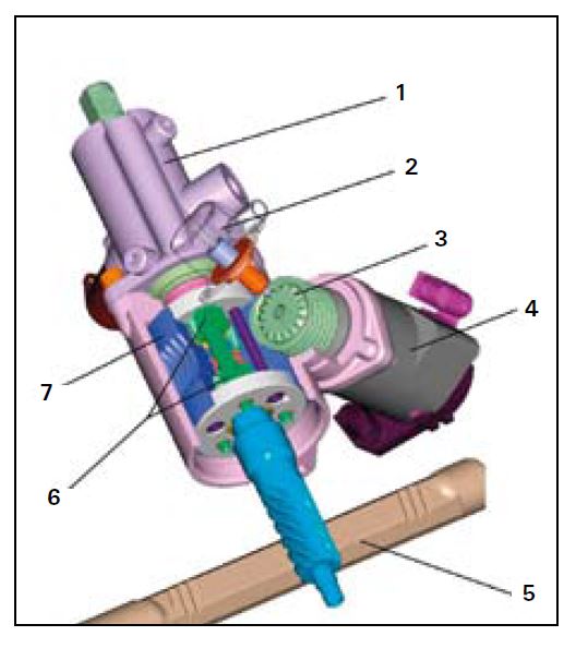 Fogasléces kormánymű villamos szervoval (1) és a kormányorsó (5), az ún. szuperponáló hullámhajtómű (3) és kimenőtengelye (4), a 3-as egység a kormánykerék axiális beállítóműve, a 6-os az irányítóegység